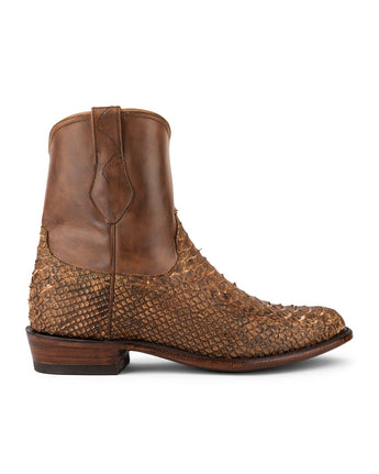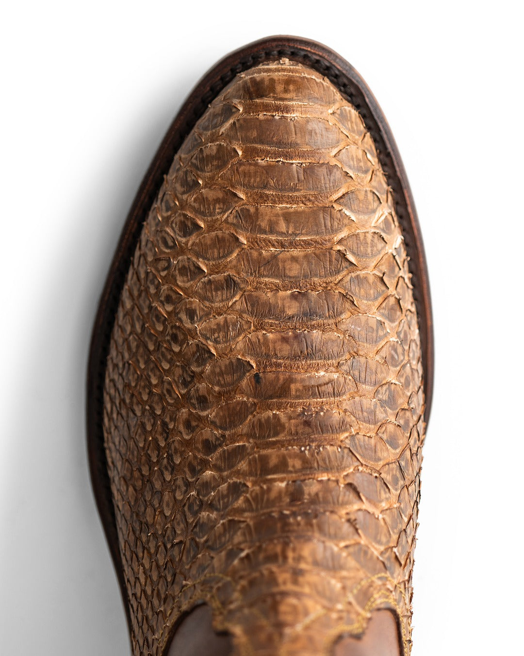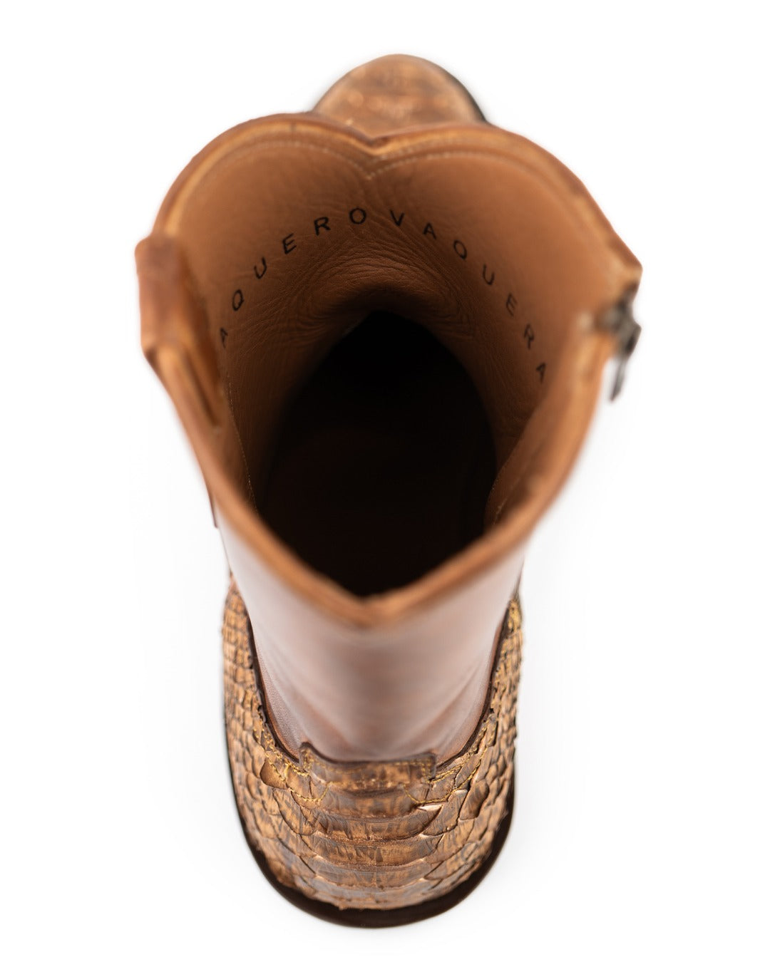 Hecha con Piel de pitón, cada bota con cierre tiene un diseño único con patrones y marcas naturales que cuentan historias de fuerza y carácter.