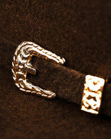 La toquilla está forjada con cuero, grabado con herrajes en acabado plata y realzada con sofisticados detalles en gamuza.