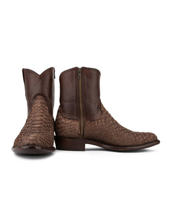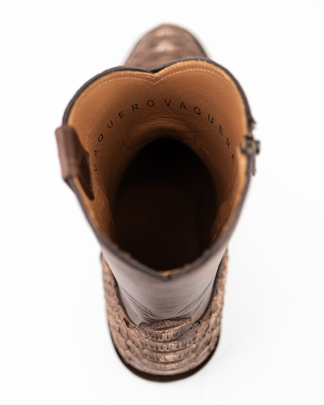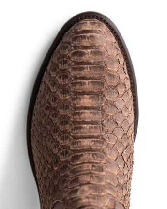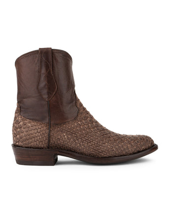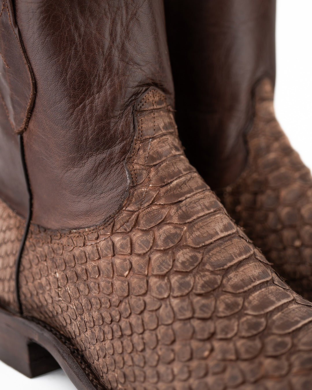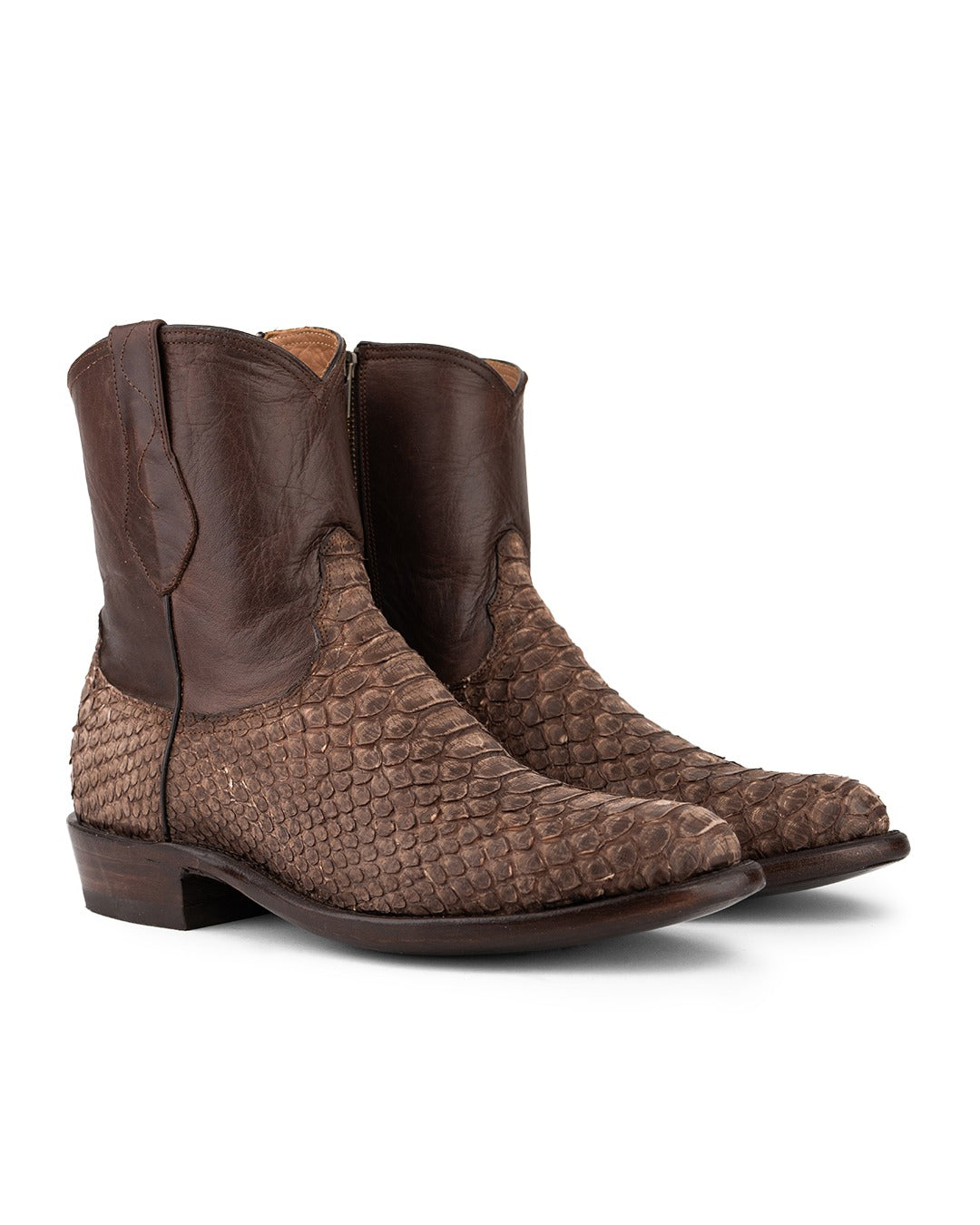 Hecha con Piel de pitón, cada bota con cierre tiene un diseño único con patrones y marcas naturales que cuentan historias de fuerza y carácter.