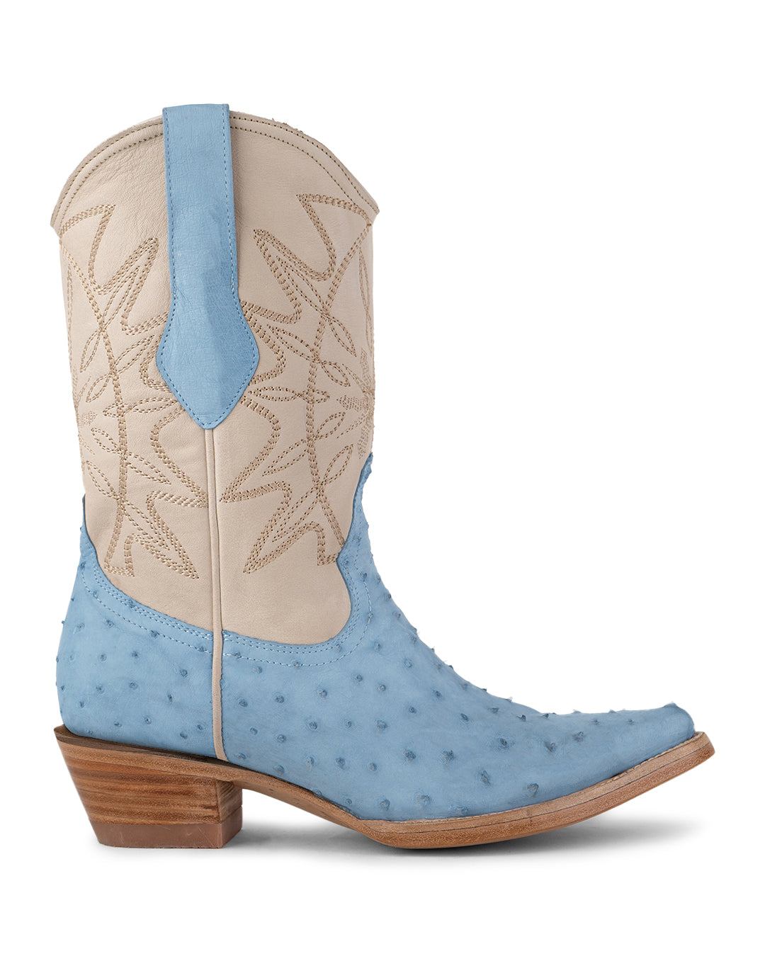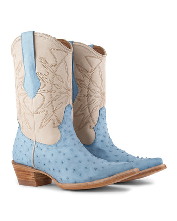 Santa Sofía Avestruz Azul es una bota vaquera premium pensada para quien busca lujo, textura y una silueta femenina con una identidad más audaz. Su piel de avestruz destaca por su apariencia reconocible y por cómo el tono azul le da al modelo una presencia distinta, profunda y con mucha personalidad.