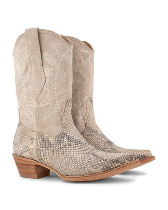 Santa Sofía Pitón Crudo es una bota vaquera premium hecha para quien busca presencia, carácter y una imagen que no pasa desapercibida. Su piel de pitón destaca por su patrón natural, su fuerza visual y la manera en que el tono crudo aporta una lectura luminosa, poderosa y sofisticada.